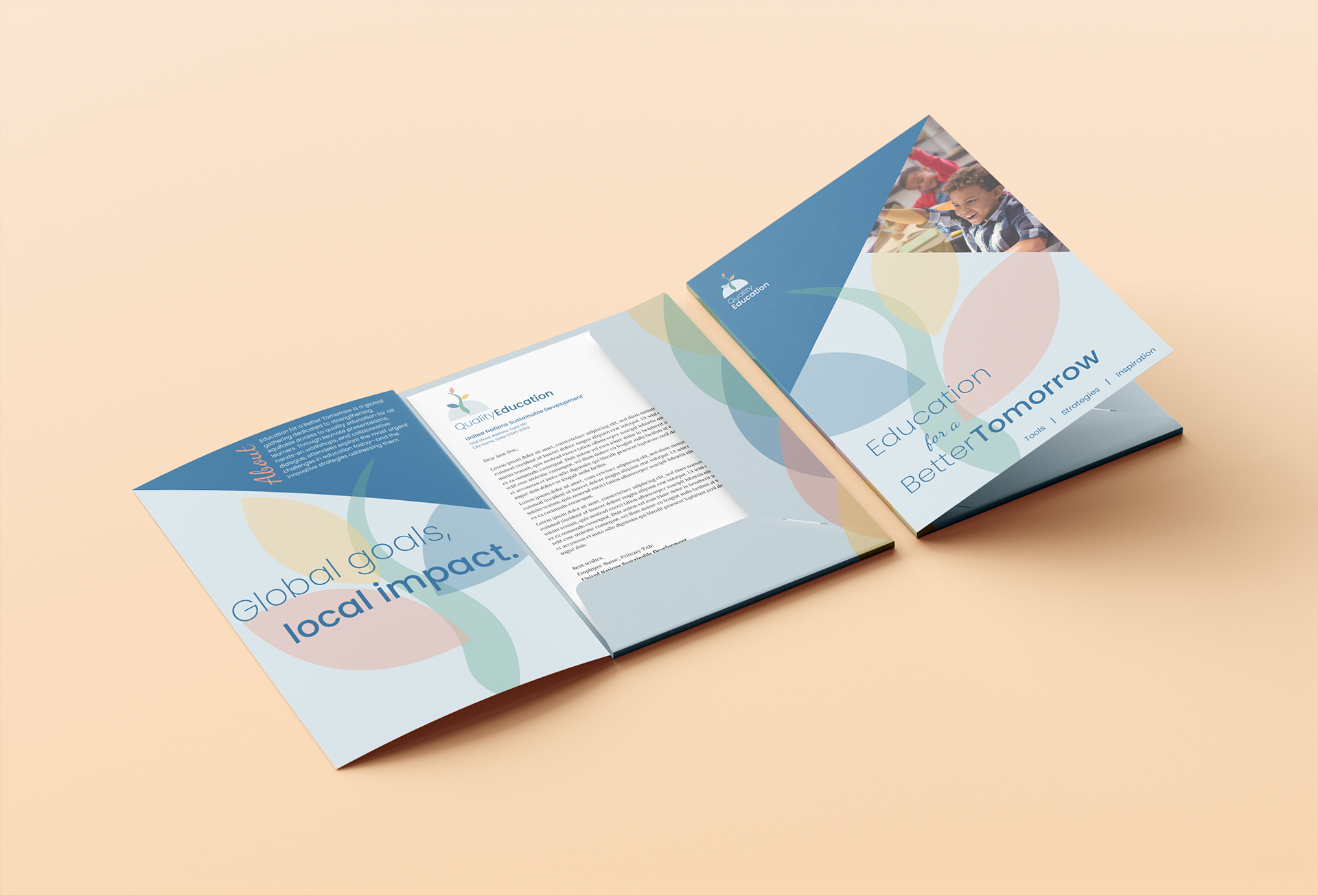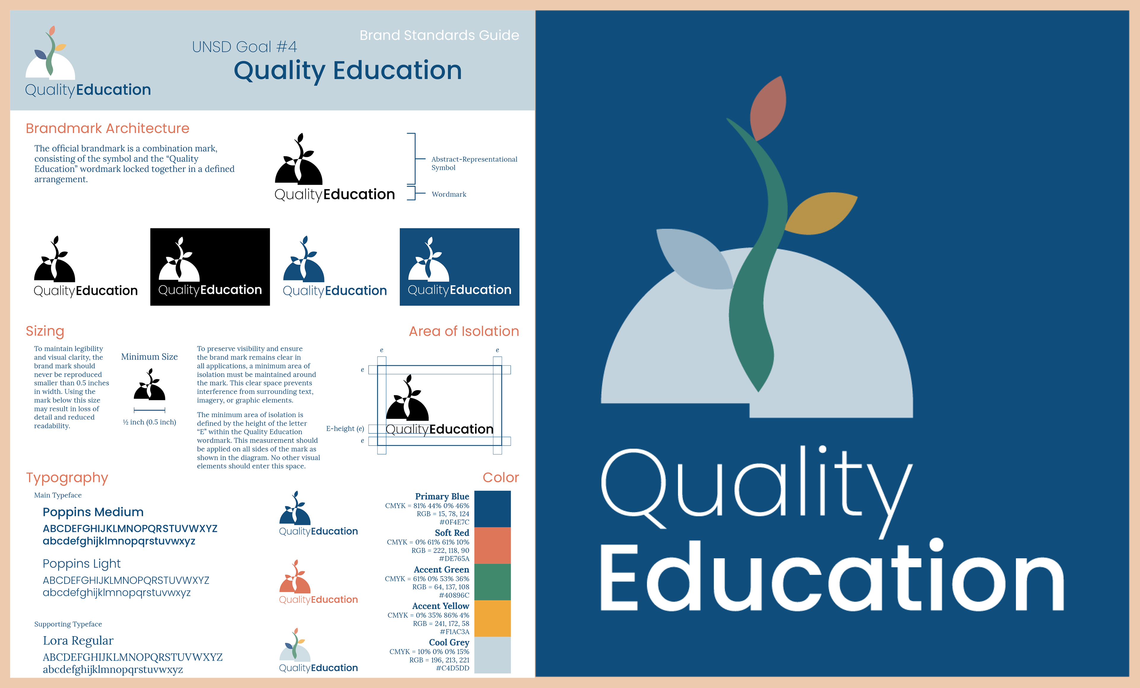 The Quality Education brandmark was developed in response to the United Nations Sustainable Development Goal 4, translating the mission of inclusive and equitable education into a clear visual identity. The symbol synthesizes geometric structure with upward movement to represent access, growth, and collective advancement, balancing institutional clarity with approachability. This project explored the development of a true meta-mark and a broader system that can be adapted across digital, print, and environmental applications.